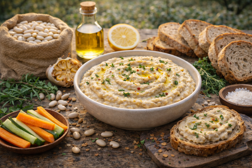 Biała fasola połączona z pieczonym czosnkiem tworzy kremową pastę o delikatnym, ale wyrazistym smaku. Pieczony czosnek ma łagodniejszy charakter niż surowy, dlatego dobrze podbija smak pasty, nie dominując jej w „ostry” sposób. To proste połączenie, które daje spójny efekt: pasta jest gładka, łatwa do rozsmarowania i pasuje do różnych zastosowań w ciągu dnia — od śniadania po lunch.