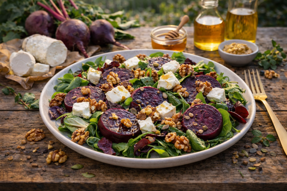 Jednym z najbardziej uniwersalnych połączeń jest zestawienie koziego sera z pieczonym burakiem. Burak od lat obecny w polskiej kuchni po upieczeniu zyskuje bardziej miękką konsystencję i delikatniejszy, naturalnie słodkawy smak. W połączeniu z kozim serem tworzy duet, który jest jednocześnie prosty i „pełny”: burak wnosi słodycz i strukturę, ser dodaje kremowości i wyrazistości, a całość można łatwo uzupełnić o chrupiący element (np. orzechy) i prosty dressing.
